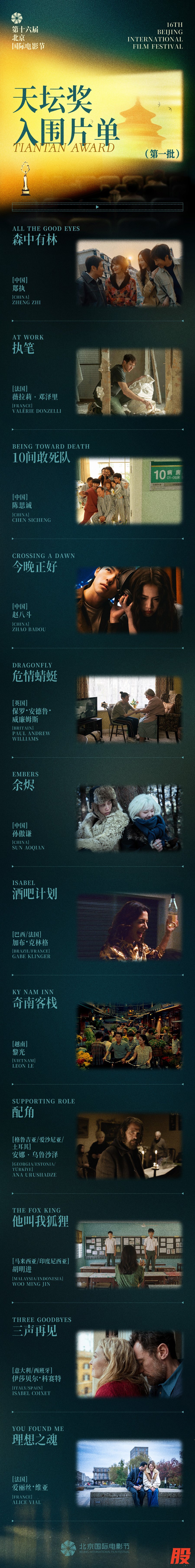 目前,第一批入围影片名单已公布,15部国内外佳作将共同角逐“天坛奖”十大奖项。获奖结果将在4月25日的闭幕式上揭晓。