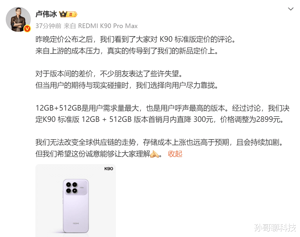 再来关注手机本身,REDMI K90系列标准版起售价为2599元,ProMax版起售价为3999元,但不同版本定价策略遭到网友吐槽。REDMI K90起步为12+256GB版本,升一个存储等级12+512GB版本要3199元,价格相差600元遭到不少网友怒斥“金子做的存储”配置。今天早上,卢伟冰表示看到了大家的失望,临时决定将12+512GB在首月降价300元,调整为2899元起售和16+256GB版本价格相同,下个月再涨价。