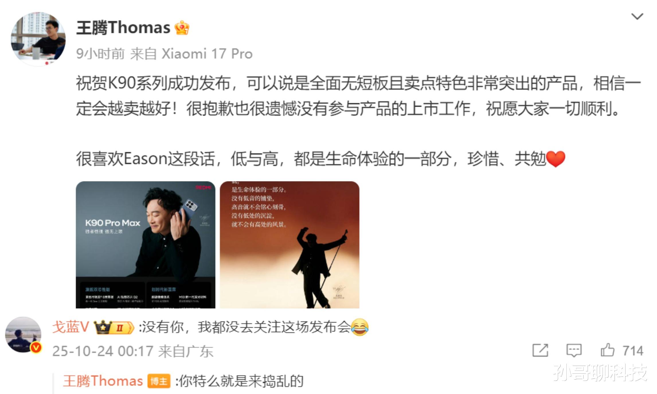 REDMI K90系列正式发布翻倍赚,作为王腾离开小米首款红米旗舰机,再次由卢伟冰亲自主持。王腾也发文表示遗憾未能参与新品发布会,没想到友商高管调侃直接爆粗口,卢伟冰一个动作打脸同行。